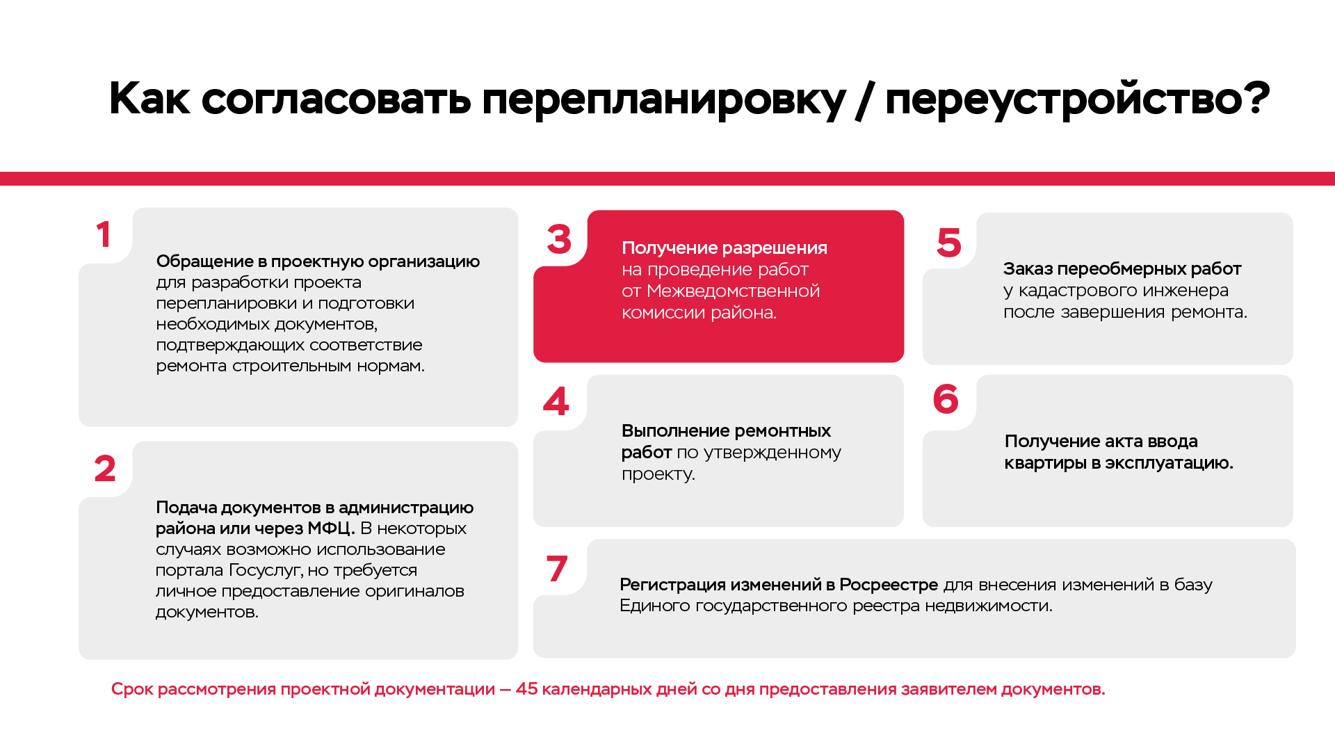 Если вы планируете перепланировку или переустройство, мы подготовили для вас памятку, какие документы необходимо подготовить и где их нужно согласовать.